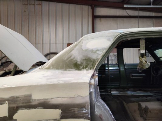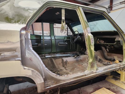 So, it got hit pretty hard, and some parts could not be salvaged, like the rocker panel. I managed to find another '70 Coronet in a junkyard (they had exactly 1) which provided the right side doors (oddly the doner car had the side bode trim much higher up than mine?) , as well as the rocker panel, rear quarter, and B-pillar. (He ended up not needing the doner's B-pillar, but I didn't know that at the time.) Apparently there was a surprising amount of bondo in the old rear quarter. (Now you might see some in the new pics, but it's a very thin layer--just filling in shallow pitting and the like, and not dent-hiding.)