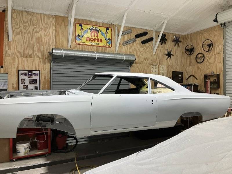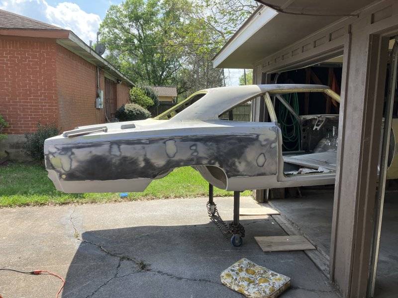 So after a few months,I have finally got to work on the Road Runner. Here’s a few pictures. Started to do bodywork on the passenger door and hopefully finished up the rear quarters where I welded the skins on. Applied the Eastwood opti flow roll on epoxy primer. I recommend it if you have no way to spray primer on. Thanks for looking.