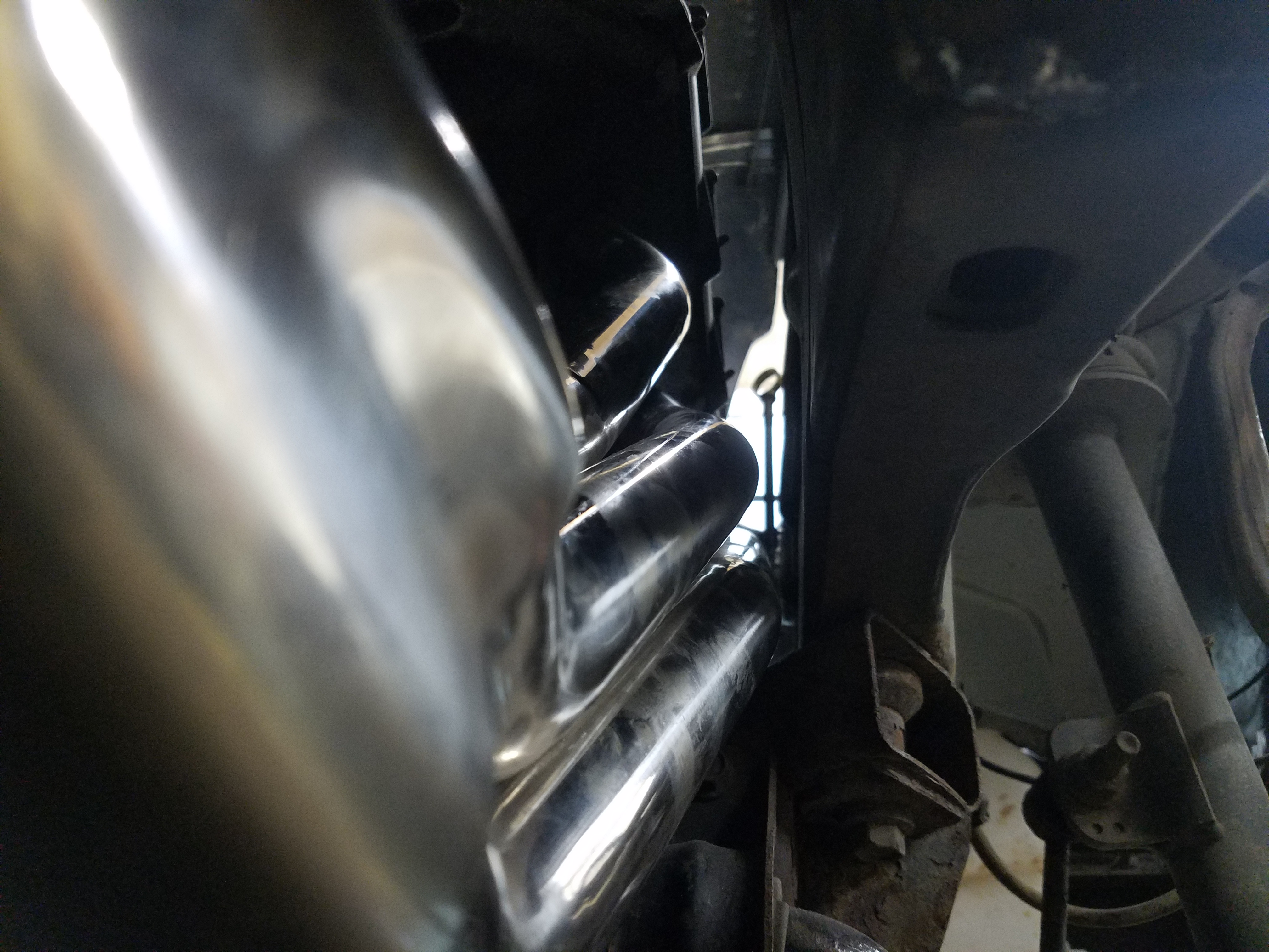 Once I had the column in place, I moved to swapping out the stock exhaust manifolds for the long-tube headers. The header bolt holes had to be "adjusted" to make them fit, but it wasn't a big deal. Picked out an appropriate drill bit and reamed all the holes. Slotted one, but other than that, it was good on the driver side. The passenger side had to have the same drilling/slotting treatment, but then also had to make a cover/plug for the EGR port that originally went into the OEM manifold. Here's a question... Should I drill that plug and put a 304 stainless tube back in to reinstate the EGR? What do you think?