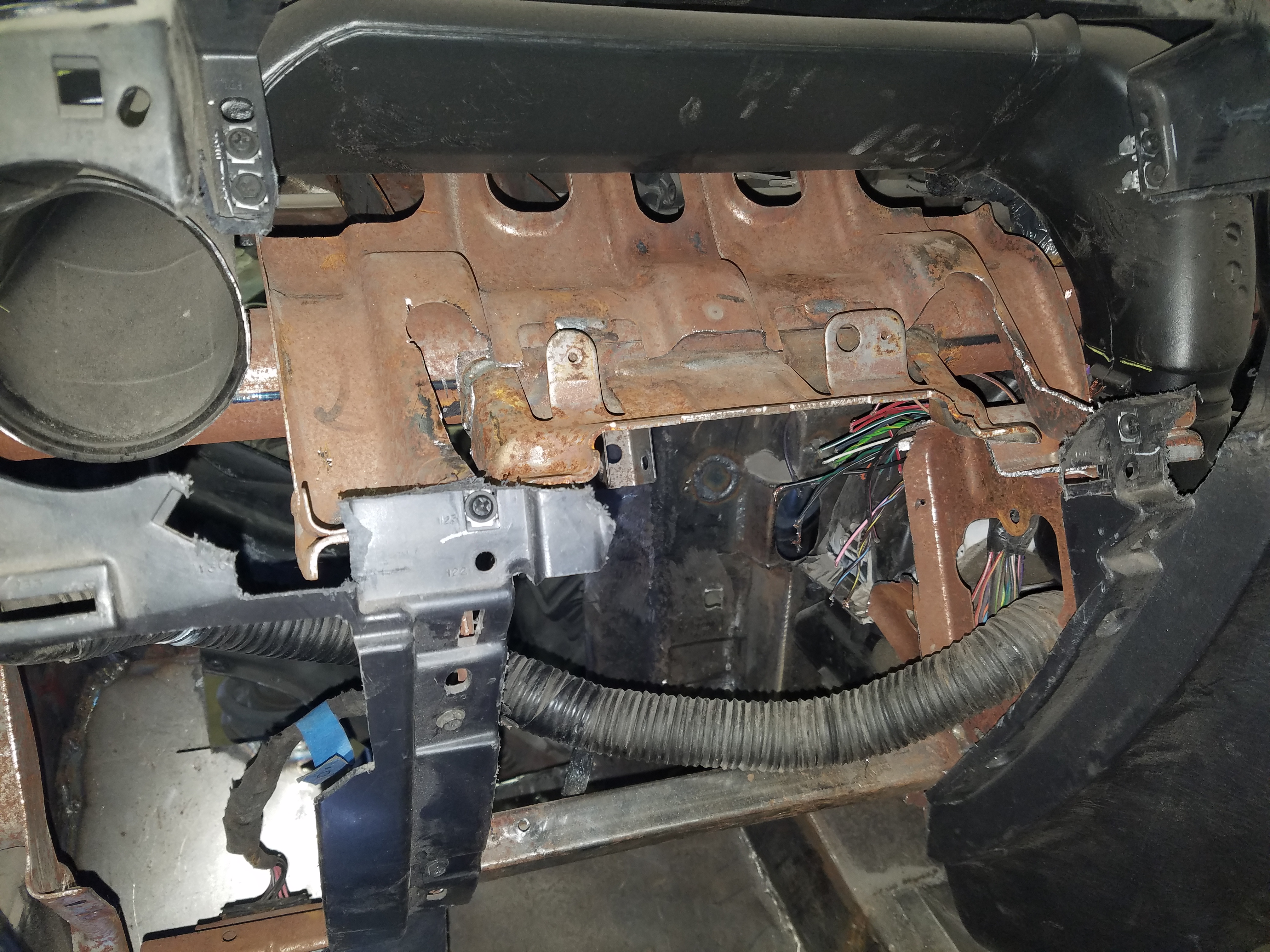 So, I did decide to use the '06 Charger steering column. I was afraid it was going to be rough to swap it in, but I was pleasantly surprised. It was about the easiest column swap I have ever done (once I got over myself and decided to take the saw to the PT dash, that is). I cut out the PT Cruiser column mount to make room for the same piece from the Charger dash frame. Then, I cut into the Charger dash frame to retrieve the column mount. Both column mounts were welded to similar round tubes on the dash frames. That made it so easy because I basically slipped the Charger mount around the round tube in the PT dash and welded it in. That was it. On the other hand, the steering shaft is a completely different story.