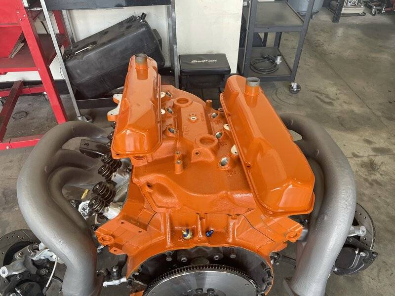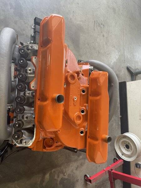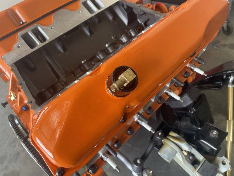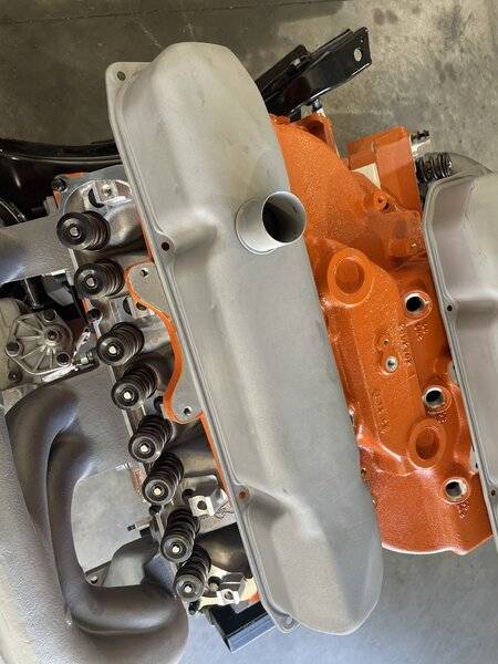 Got the valve covers back from being powder blasted to remove the old paint. Also had the oil breather and pcv valve holder powder coated black. Primered and painted the valve cover Hemi Racing Orange