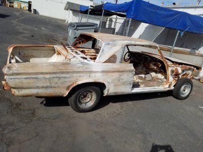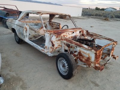 I have a rust free rolling body. Was a big block, 4 speed car, buckets, console originally. Only parts left are the doors and trunk lid. I do have a savoy donor car that's mostly complete. Have 4 speed pedals in it, manual steering too. Will sell together or part out