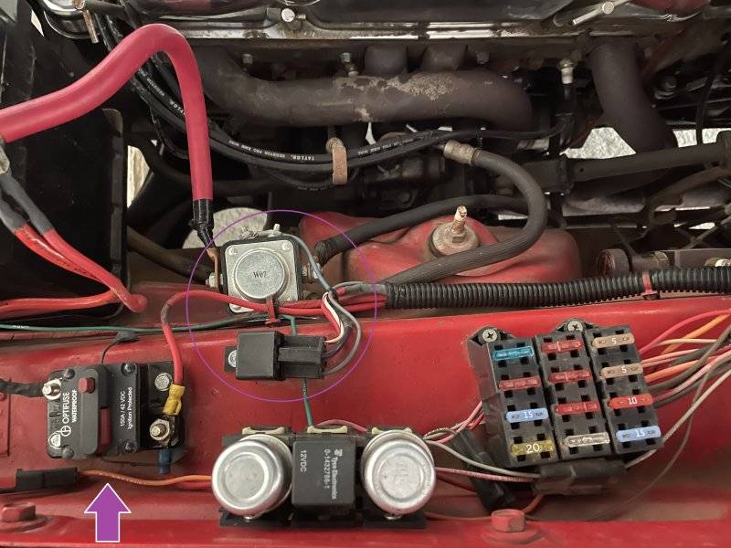 And here is a closer look at the right side. I am assuming one of those fuses is for the alternator. The purple arrow on the bottom left is pointing to an orange wire that says "ignition fd" that is not attached to anything, but it has always been like that. What is that square/rectangular thing that says "W07" in the purple circle? Is that some sort of starter solenoid? And the thing right below it that has a plug in it, what is that? Could the issue be the relay in between the flasher?