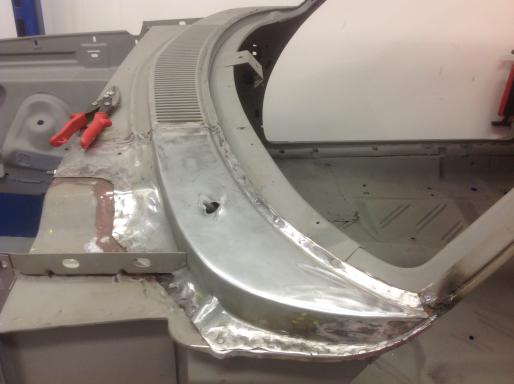 A single cut wasn't deep enough, so the slot was enlarged about the thickness of 2 cut off wheels. The screw drivers re-inserted between the door and 1/4 panel to get the needed gap. The panel is currently just randomly tacked. The enlarged radius will be welded out before the body work is completed.