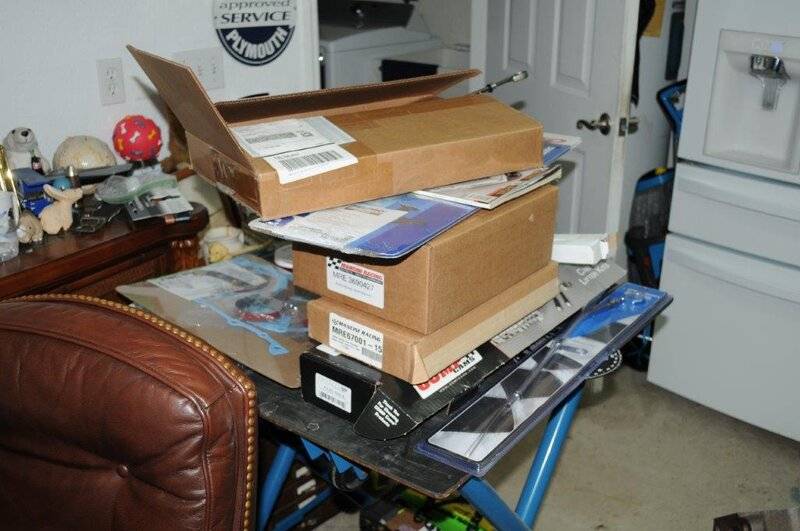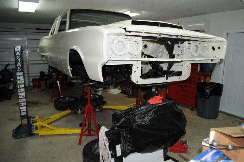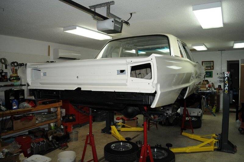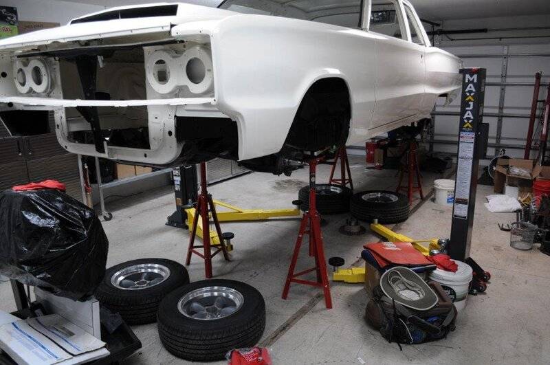 Got the car up on roller skates, dash and trim painted Dark Blue Iridescent (metallic). New aftermarket power steering box fits well with some space to spare from the shock tower. Also the Moroso lug nuts fit well with American Racing Torque Thrust D's - see thread here: https://www.forbbodiesonly.com/moparforum/threads/ttds-with-2-studs-disc-brakes.193208/ . See pics...