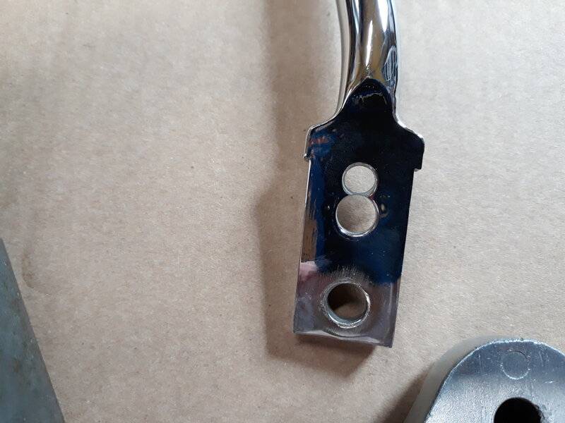 THE BASE OF THIS SHIFTER HANDLE HAS HAD THE SECOND HOLE DRILLED SO THAT IT CAN BE USED WITH THE LATER MODEL BOLT IN STYLE SHIFTER.IT DOES NOT AFFECT THE ORIGINAL SLIP IN STYLE MOUNTING.