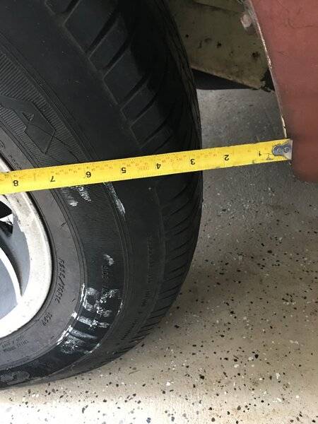 I am not sure of the history of the car and do not think it has been aligned in a long time. Tire size is 235/70R15. American racing vector rims I believe, backspacing 3.75". I do not think the front end is sitting low. When I did the front brakes I just installed the spindle and discs. I have attached photos below of the gaps between the fender and tire for driver and passenger. The passenger side tire appears to be 1" closer to the front of the car when the wheels are pointed straight.