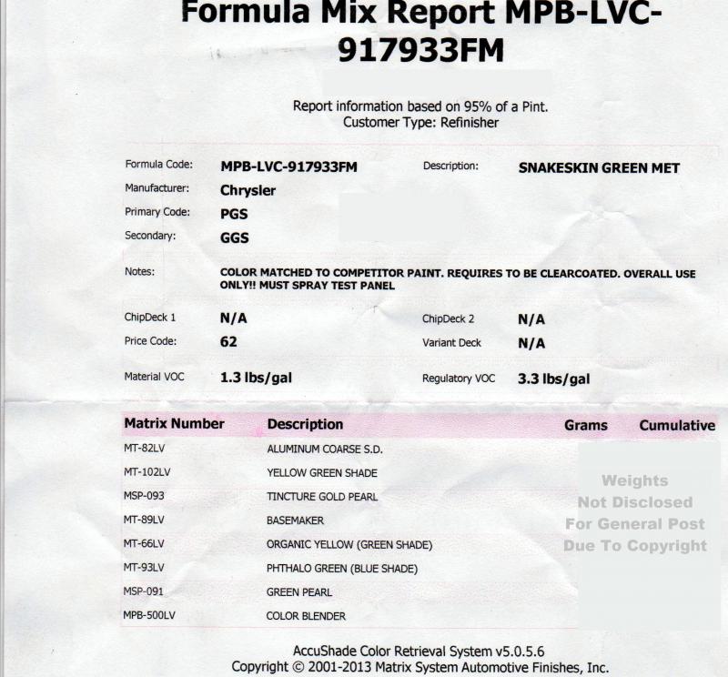 The original paint can be easily found through normal means, or mixed from scratch by your painter. The formula will vary, depending upon the brand of paint being used, but this gives you a general idea of what all goes into the mix.