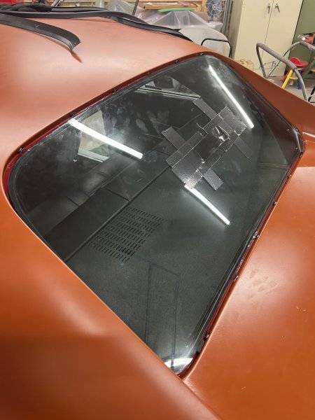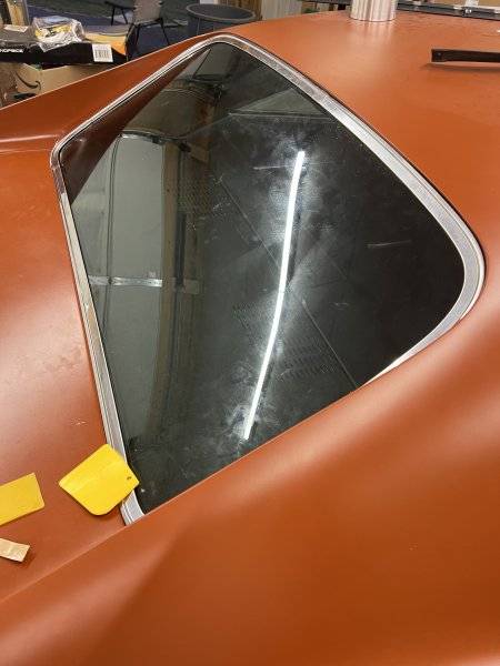 Then I moved to the top, pushing the gasket up from the inside with a wood paint stirring stick, then from the outside popped the gasket over the edge of the glass with a body filler spreader. Smacking the glass all over with my palm while I worked my way around.