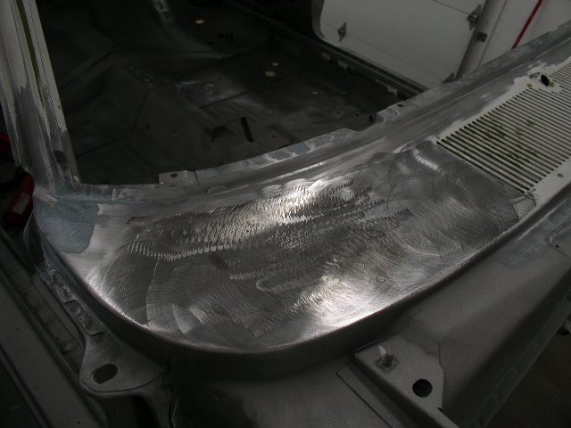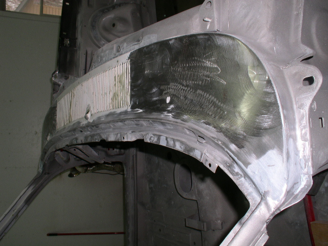 Wow, excellent work on the quarters.I for some reason didn't take many pictures showing the quarters before priming. Not that they ended up with a lot of filler, but basically were skim coated and long blocked out. Each side had a bad bulge right behind the wheel well. This was taken out with a shrinking disc, other high spots hammer & dollied out, and then skimmed over. The body line was horrible also. This is about the only shot I have before epoxy.