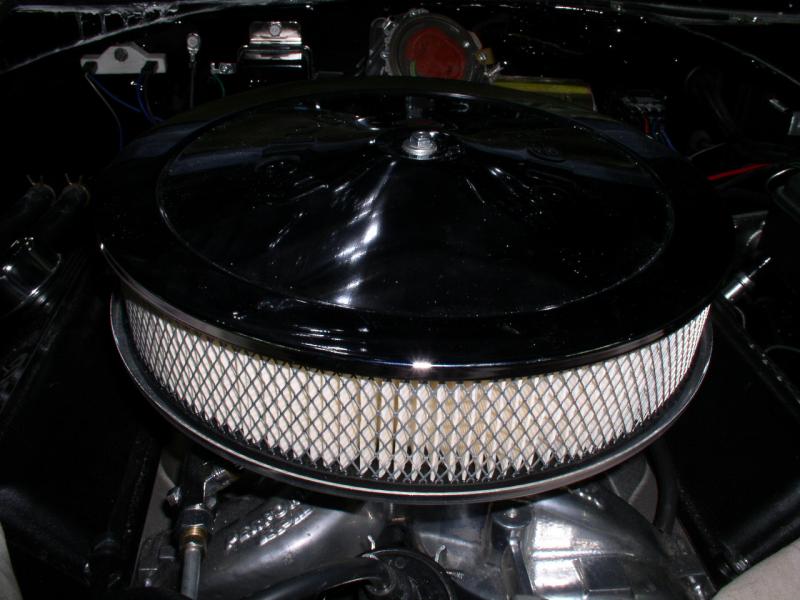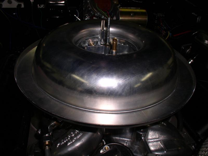 Here is what it looks like now. I then bought a Holley air cleaner that comes with a 1.25" drop, but only used the top and filter. I still can't use the supplied stud nut because it is to tall. I put a flat washer and nut on the stud cut off as short as I could. This leaves me with .75" from this to the bottom of the hood. I have a hood pad insulation that I want to use, but am thinking it might not work. My restricted area from the top of air cleaner to the bulge in the base leaves me with 3/4" of air flow around the opening of the carb. I wish this was more, but as of now that is the best I can do and still shut the hood.
