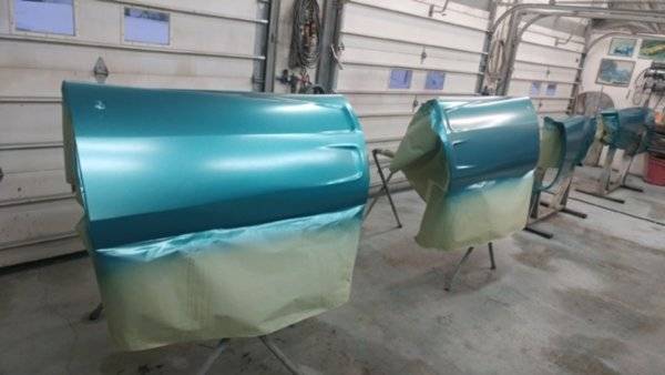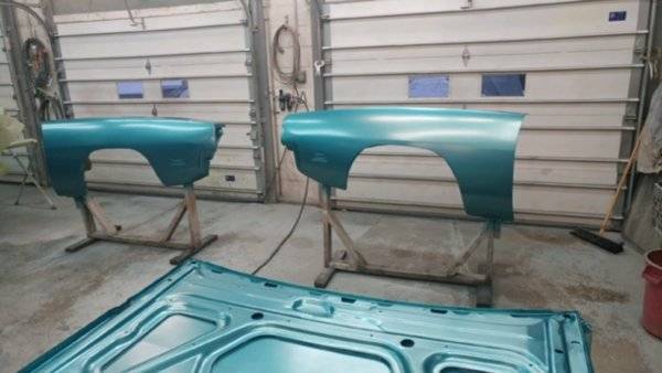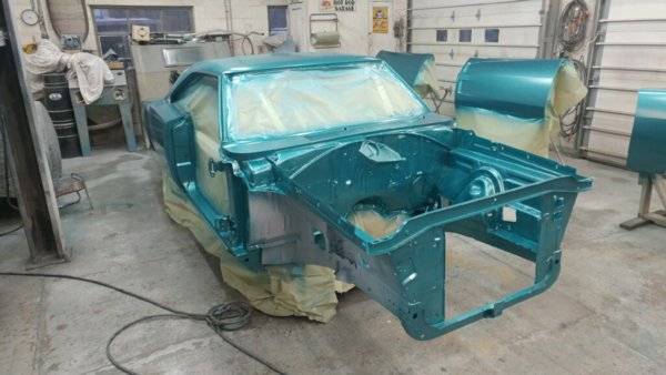 Midway I changed my mind on the color, I started to see that mango color on so many cars, so I went with my second choice. It is almost a QQ5 color. I added a touch more metal flake. So far I like the choice. As stated before, It will have a black vinyl top. We are debating on the black or white rump stripe. Once the car is painted I can start to put it together. I hope to have it finished painted and buffed within 3 weeks. Still can't believe that has taken this long. Thought I would never see parts of it painted.
