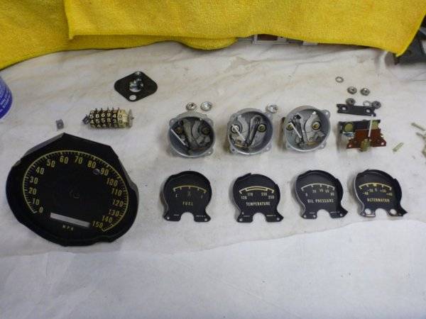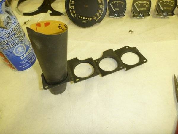 Gauges drilled apart and odometer (56694.1 miles) out of speedo, ready to lightly sand and then paint faces.