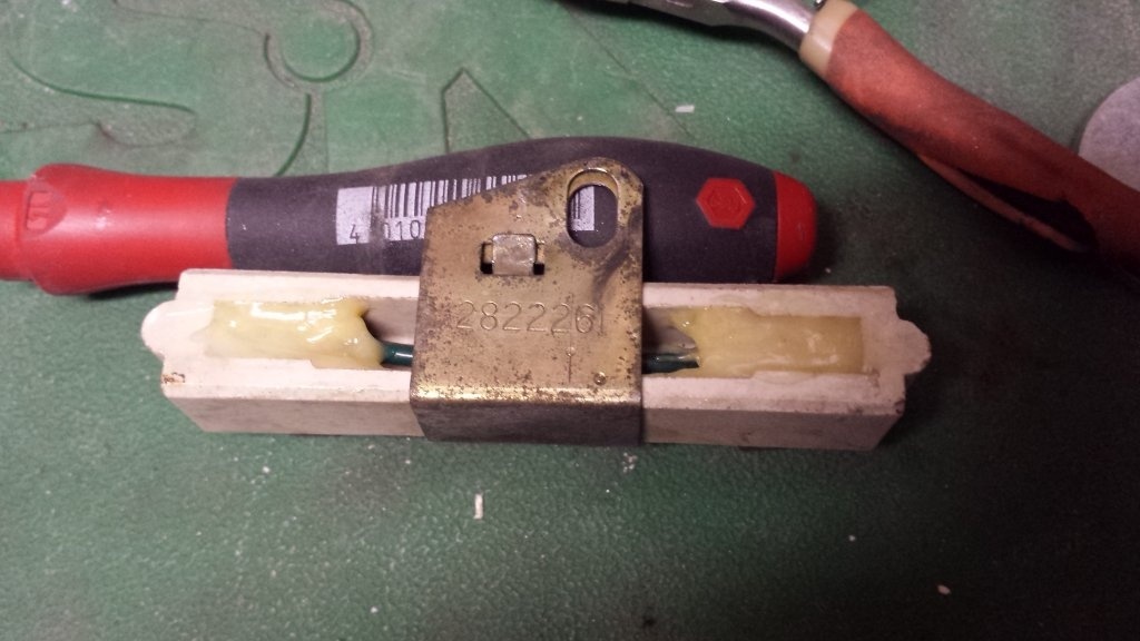 And finally, I modified my ballast resistor with a straight piece of wire. I am going to use a Pertronix II ignition and coil which doesn't use the resistor but I like to maintain the factory look. Cleaned the old housing up and pulled it apart. Pretty simple, the resistor is just crimped on. I cut a length of wire, stripped the ends and soldered them into the terminal ends. To keep the terminals in place, I used the left over bit of Acraglas to hold the wire in the ceramic housing.
