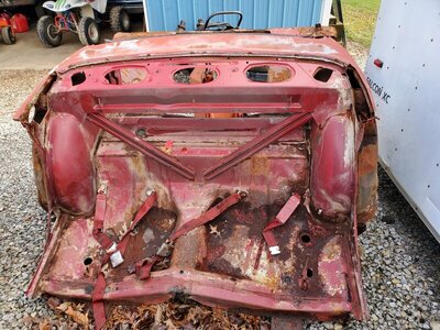 The quarter where cut to put new AMD skins on. The skins are screw down for now the passenger side outer wheel well was put on and driver side need put on I have that as well. Also new AMD door hinges. I have a set of real nice original door shells and a back half rear section with very nice original rear frame rails and inner wheel wells.