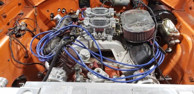 Crane Alum rocker arms, 1.5 ratio, Crane shaft. Milodon 7 qt road race pan and pickup. Melling hi volume oil pump. Edelbrock dual quad dual plane intake. 2 600 CFM Edelbrock carbs. Pertronix billet double strike distributor, box, and coil. Edelbrock RPM Alum heads. Billet Specialties serpentine system w polished P/S pump, altertnator, and AC compressor. 3/8 stainless fuel line w return. Spectrum fuel tank w in tank fuel injection ready fuel pump