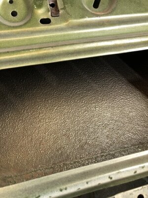 Unless you are going for a concours car or have money, energy and time to burn. I'd wire brush a little as needed, a little sanding here and there, clean it good, apply good sealer, then hit it with $3 walmart spray cans. Heck, it's never going to be seen and will never rust from the inside again, within the next 50 years anyway. Then put the extra money, energy, and time saved into other higher priority things.So I am not sure the best way to proceed on the floor. I would love to get it sand blasted and then epoxy it but the motor and trans are in and I am not sure if thats a good idea. Any thoughts or suggestions on what I should do to prep the floor here?