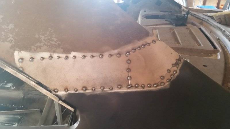 My sail panels were rotten for 3 inches above where the vinyl sat. I guess it trapped water. Both sides were identical. After fitting the new quarters, I removed all the bad metal to where it was still solid enough to weld, and made the patches. The photo only shows tack welds, but it was welded solid before applying fibreglass.