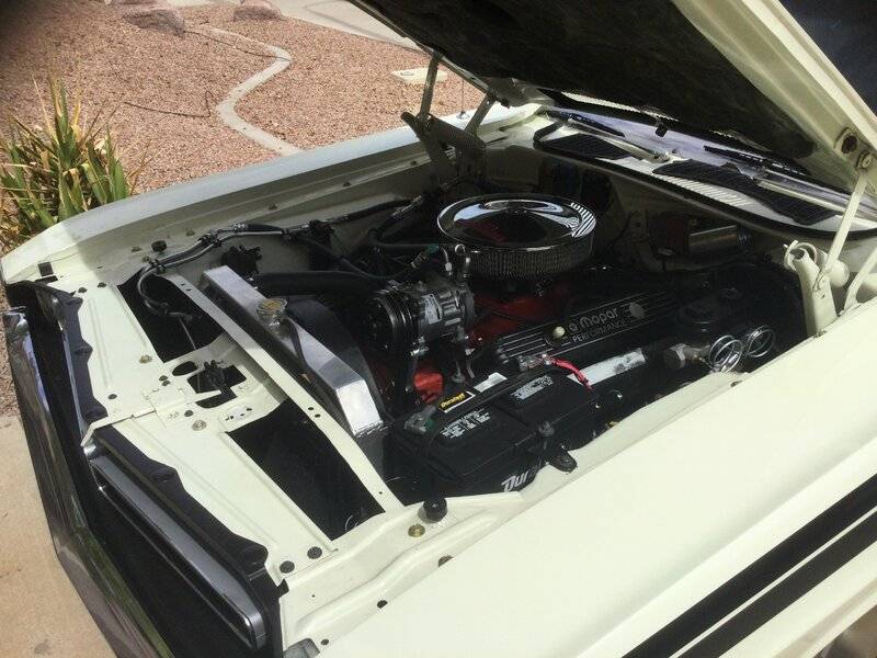 This car has been totally stripped, replaced many body panels, primed, and painted Spinnaker white with a black vinyl top. With front valance chin spoilers, side quarter scoops and trunk ducktail spoiler, on the outside, it looks like it’s an RT Challenger with Mopar rally 15”x 7” wheels. It has all factory suspension with front and rear sway bars. The powertrain, from front to rear, a fresh 383 bored .030, over. A small bump up on the cam but not too crazy. Topped with a Fitech 400 horse EFI fuel injection system with fuel pump in the fuel tank. It has a 4 speed, 833OD transmission. It has a dual exhaust system that is an exact factory replica. The rear axle has been converted to disc brakes to match the factory front power disc brakes. The 8 3/4 differential has 3:55 gears with a clutch limited slip.