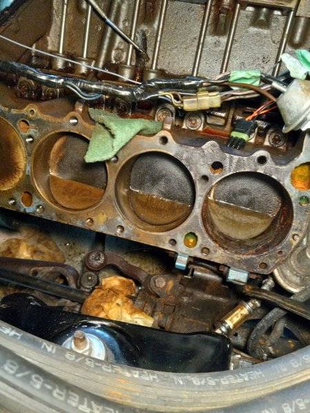 Finally had a chance to do a little wrenching yesterday on the Charger. The plan was to remove the heads and also drop the pan. I was pretty much expecting what I found. Enclosed is the pic. Looks like the mota comes out. Here is what I believe happened to cause the water in the mota. Seems whomever thought it was a great idea to put the 6 pack setup on the car never really finished the job. Pretty much ever bolt I touched yesterday was not tightened. The heads did seem to have been torqued properly, but that was about it. Exhaust manifolds were loose, the alternator was loose, along with the AC compressor. My Hypothesis is they worked on the car, never closed the hood and had the air cleaner off. The intake valves that were open filled with water. I'm stuck on getting the drivers side head off as there is one exhaust manifold bolt I can't get a wrench on. It is the one that recessed (last one all the back towards the firewall) and about 1/2 inch from the steering column. Any ideas on how to get to it is appreciated. Maybe I need to remove the Engine mount bolt on that side and jack it up just enough to get a wrench on it?