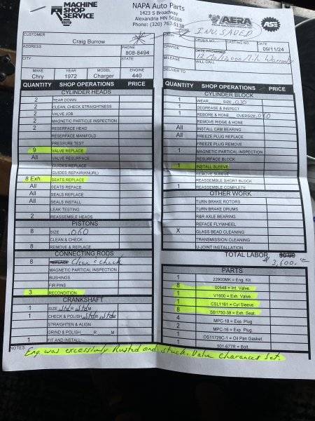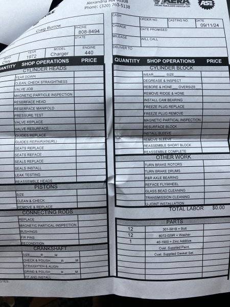 At long last I have an update worth mentioning! The Mota is finally complete. Time to pick it up and find some time to drop it in. It ends up as mentioned before the thing was already 30 over. It is now 60 over with one cylinder being sleeved. Hell of a deal. So, all new pistons, 9 valves, cam, bearings etc. The crank, block and rods are still original. Enclosed are a few pics including the engine invoice.Thought I should start a thread here on my 1972 Charger SE. The car has an interesting story that I thought some folks might appreciate. The car was a barn find car I guess, although it was stored inside for most of its life. The story starts a few months back when my cousin gets a call out of the blue from the son of an old boss he worked for many years ago. The son asked my cousin if he could store a few cars over at his place as his dads girl friend had someone push the cars outside and was starting to sell parts off of the cars. A few days go by and the cars arrived. A Testarossa, Pantera, ZR1 Vette, 32 Ford Vicki, and the Charger. I had flown out to my cousins place to take in a few car events including the Mecum auction. This was back in August. I took one look at the car and bought it.