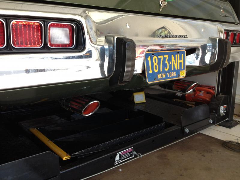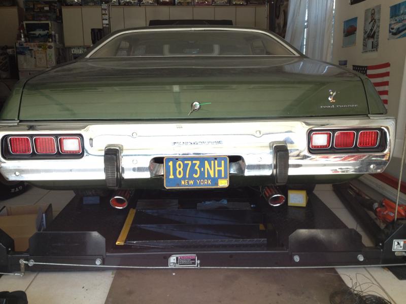 Could not help but mock up the factory exhaust tips that came with the car. I had purchased these 1973 NY plates complete with nice 73 sticker at an antique shop last summer long before I knew I would be buying a 1973 car. What a great fit.