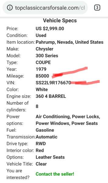 "Although the "'79 300" is an optional sales package based upon the Cordoba, the combination of complete appearance, drive train and chassis upgrades coupled with the deletion of all "Cordoba" references, gives this car a separate, distinct identity. The first '79 300, vehicle identification number (VIN) SS22L9R139989, was a Cordoba which was converted at Chrysler's Clairpoint pre-production plant. Beginning in November 1978 and continuing through to June of 1979, Chrysler Canada's Windsor Assembly Plant built 4,292 units, including 477 for the Canadian market. Overall, 77,334 Cordobas, for both US and Canada, were produced from August 7, 1978 through June 22, 1979."