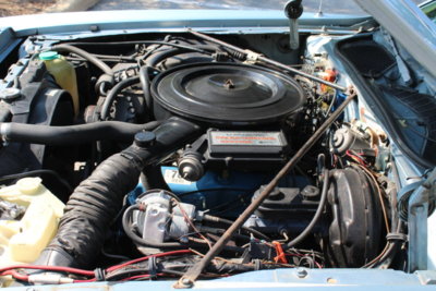 This Cordoba has a few mild modifications for driveability and performance purposes. The engine has an upgraded camshaft with factory 340 specifications, Edelbrock Performer Intake, Thermoquad 4bbl with factory kickdown linkage from a 4bbl Cordoba/300. The Lean Burn has been removed and a Mopar Electronic Ignition has been installed. Also, 2.5" dual exhaust has been installed and the catalytic converters have been removed long before I bought the car. I just did changed the oil using Brad Penn Racing Oil and used a NAPA Gold Oil Filter.