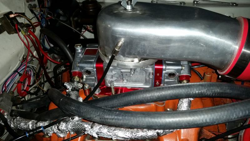 I did some testing today.. run the car on 95 unleaded fuel and drove it with hood closed, went in to my garage after some test n tune and left the car with the hood open and after aprox 15min the fuel bowls was empty. I have now a phenolic (spell) spacer under the carb but it doesn' seem to help. The engine starts with part throttle but runs very rich at start up. So back on square one.