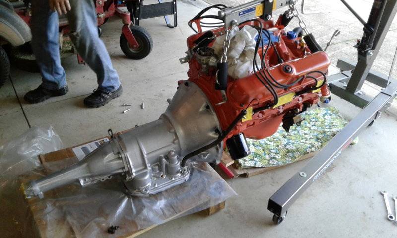 Then get the car in the air and slap the trans & convertor in along with the cross member.