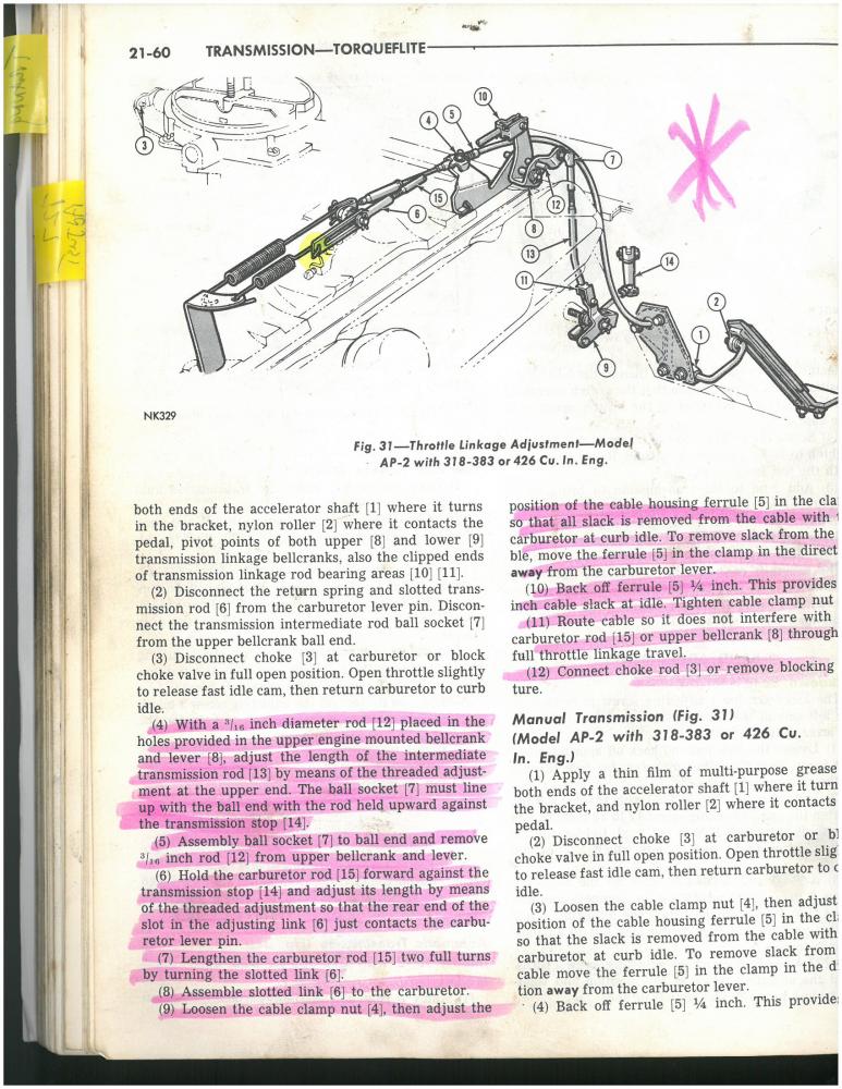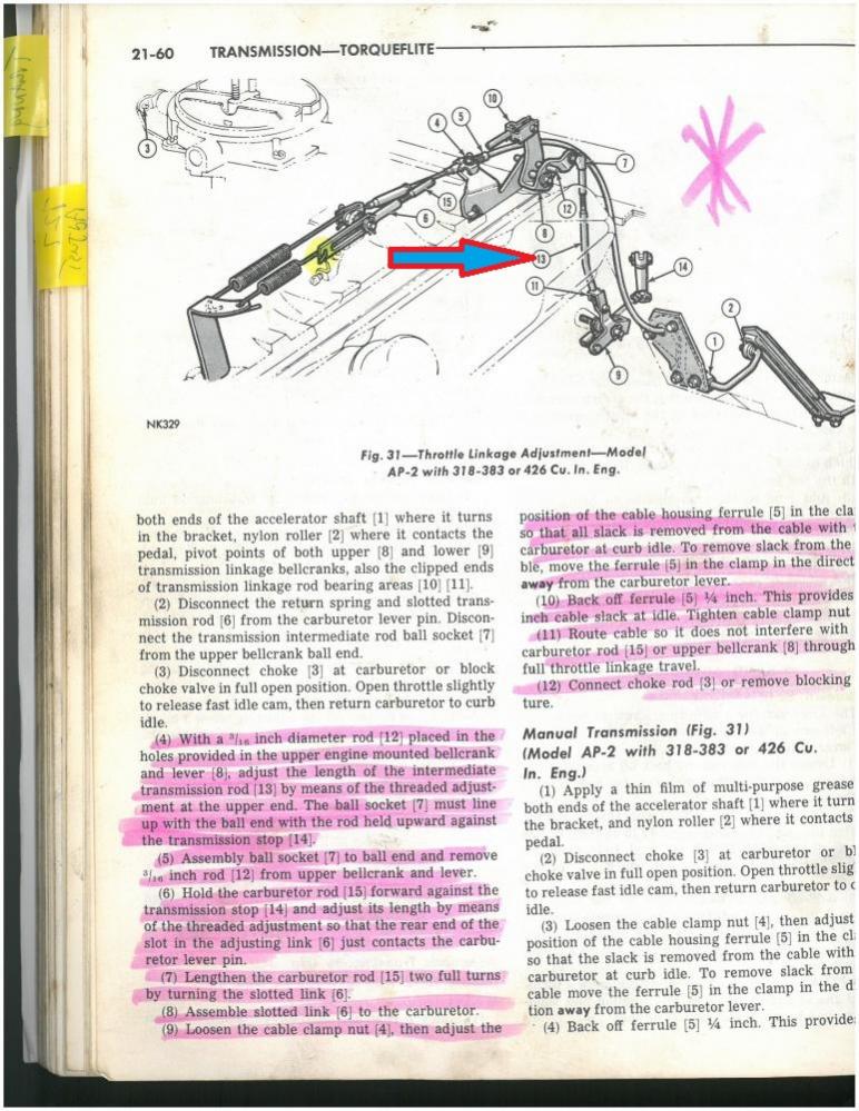 I have a 440 with a 1407 Elelbrock carb along with the 1481 Throttle lever adaptor . Went through the procedure with 3/16 drill bit , aligning the bracket for proper kick down with no success. I have the rod adjusted (Ref # 7) as far as it will go with out popping off and still no kick down. I made a few modification by adding a bolt and nut to carb rod ( Ref # 6 ) and got some kick down but not much. So know its in the linkage, Is there another part needed when using edelbrock system ? View attachment 207634