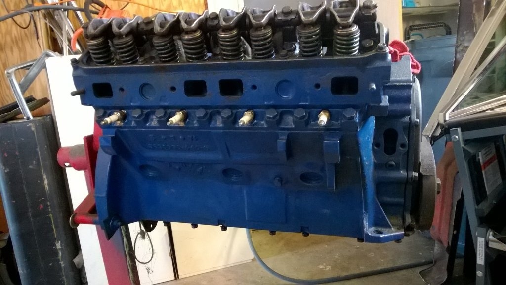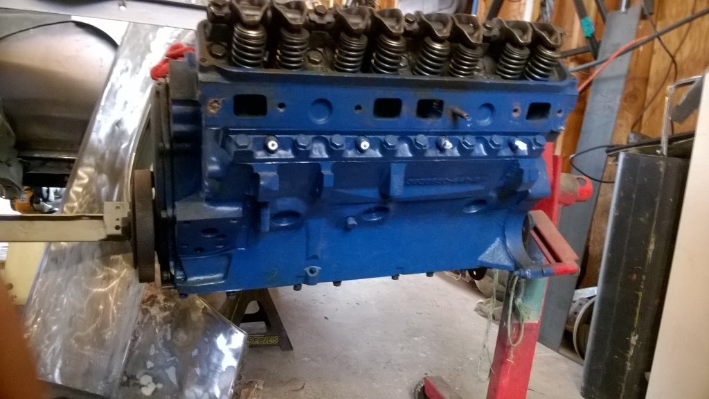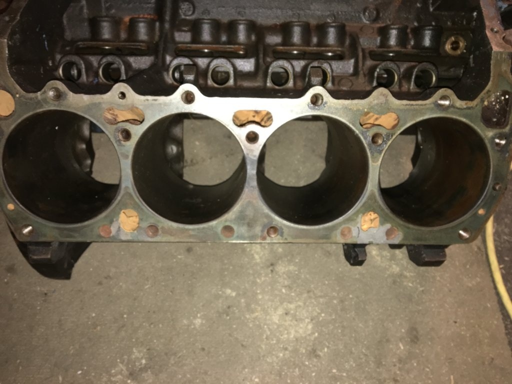 4.32 bore/ 3.75 stroke, built in Trenton 6/4/1974. From what I have gathered so far, the open chambered "902" heads flow as good or better than the "906" heads. This motor has the raised rib along the sides of the block just above the freeze plugs, thicker ears, 10% more cast iron in the block, good thick cylinder walls so I can bore it .60 over if I like, raised deck, increased sized cooling passages, and is classed as a truck engine. The scoop says the cast crank is fine up to 600HP as are the pistons and the block. So I guess my path forward will be to have the block and bare heads hot tanked, sonic checked, honed/bored .30 over, parallel decked, and hardened seats installed on the exhaust side. A 30 degree angle cut on the valves is also a good bet. Porting and smoothing, Gold Race rockers, new springs, small cam, 850 Demon, M1 intake, 2" carb spacer, high volume oil pump, 3/8 fuel line, new rings, performance gasket set, performance ignition. With those things installed it should put out 502 LB-FT @ 3700RPM, 512 LB-FT @ 4900RPM and 519 HP@ 5400 RPM. or thereabouts..lol.