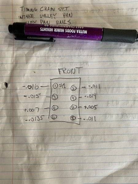 Here is a better picture everything is pretty close right side of block 2 and 8 are both .011 down, left side 1 and 7 are within a couple of thousandths, the problem is cylinders 5 and 6 are positive sticking up out of cylinders.005 and .007 thousandths. Decks look pretty level to me not perfect but plenty close. With exception of cylinder's 5&6 which seems to me the crank on that journal was ground different then the rest
