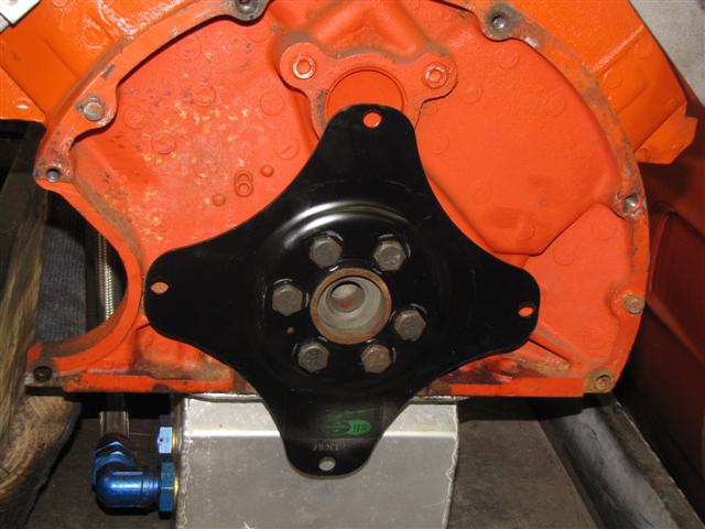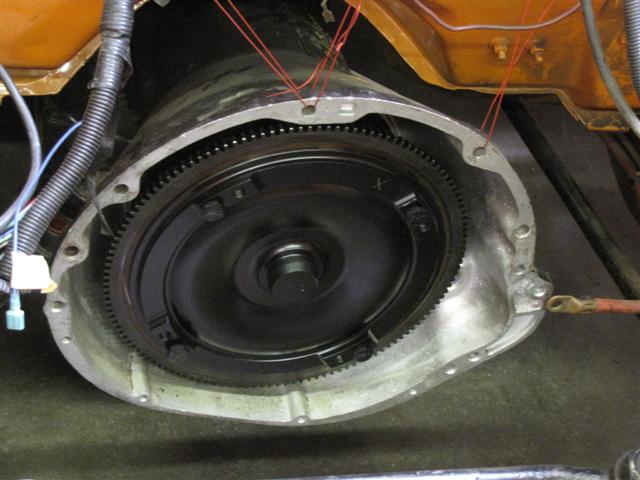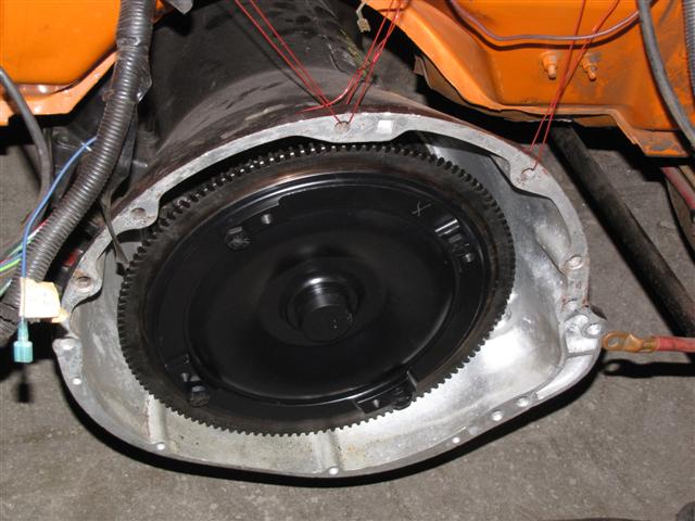 Here are some pics of the tranny and torque converter going in with the flex plate. The one shot of me getting ready to prime the engine through the oil pump.