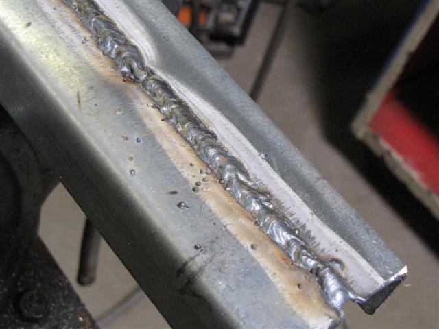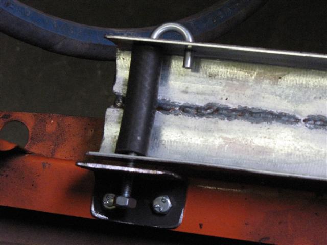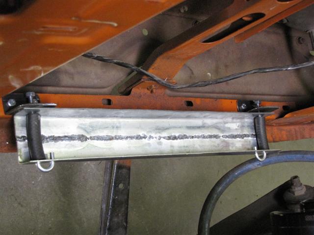 This is my solution to the radiator fabrication issue. I want to thank John for giving me this idea. I bought a 3' piece of 1/8" angle iron from Lowes and cut it in half, then welded it together to make a U-channel. It had a zinc coating on it so I took that off with the wire wheel and grinder. Then I used these 3" bolts with hooks on one end to secure the U-channel to come brackets I fabbed from some square stock I had laying around. I love working with that plasma cutter. It makes life so much easier. I took some old fuel hose and placed the bolts through it so the radiator can rest on it and take up some of the vibration. I used those same bolt hooks to secure the top of the radiator. I am using some plastic donuts I fabbed from plastic tubes and I am sandwiching them between rubber washers to finish this off.