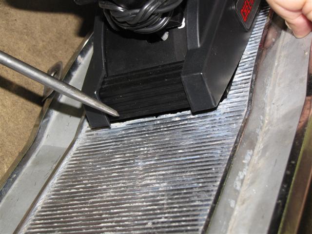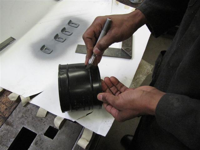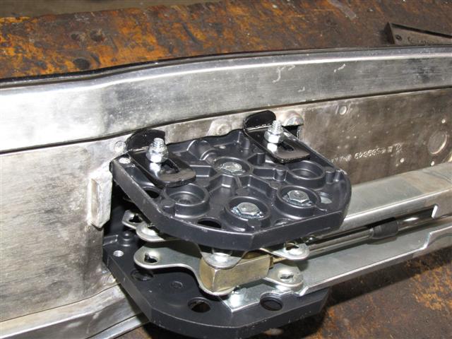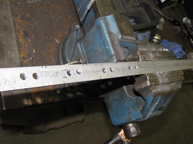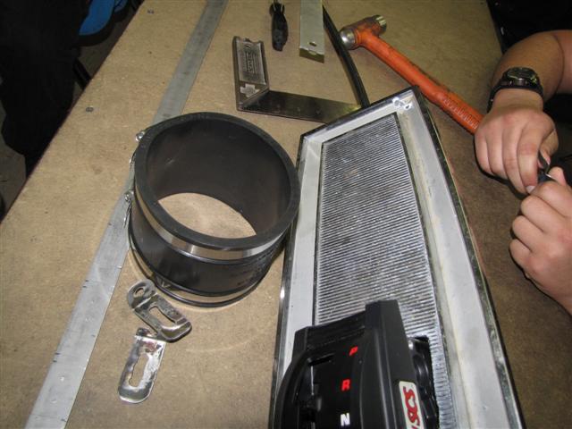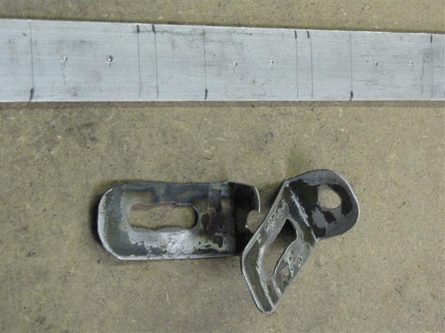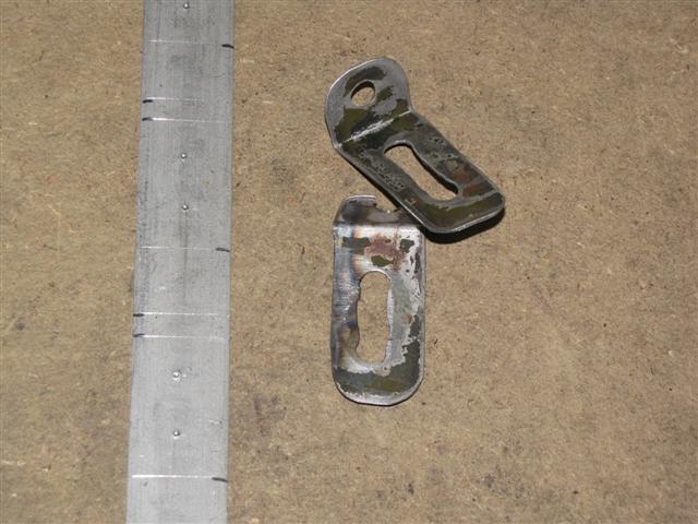 The small green brackets are the sheet metal ones that I am throwing away. The large rubber pipe connecter I am using as a filler material for the gap between the edge of the shifter base and the console panel. The shifter will not sit flat on the console plate because it is curved. I could cut the base of the shifter to fit the curve of the console plate, but I thought the rubber would be equally effective and a whole lot easier. Why the round rubber pipe sleeve? I could not find a flat piece of rubber anywhere, so I will cut this to fit and see how it works. The scratch awl is pointing to the gap between the shifter and the console plate. I started cutting the holes in the steel flat stock. Enjoy!