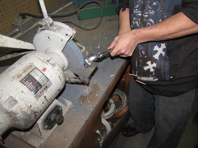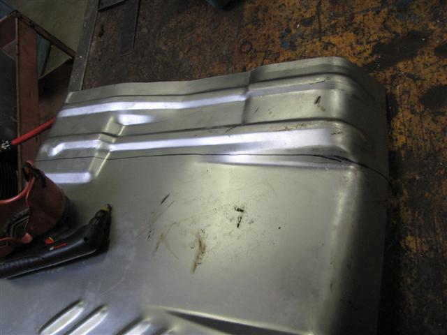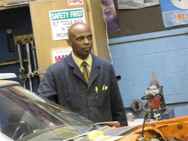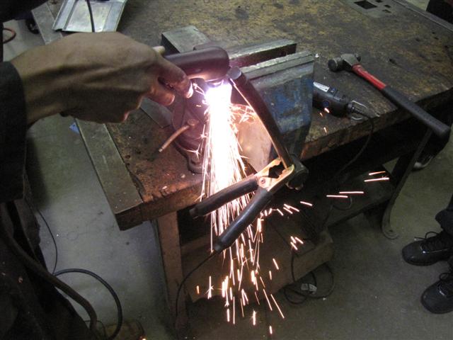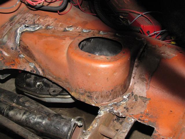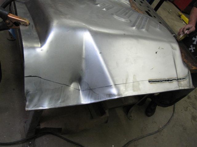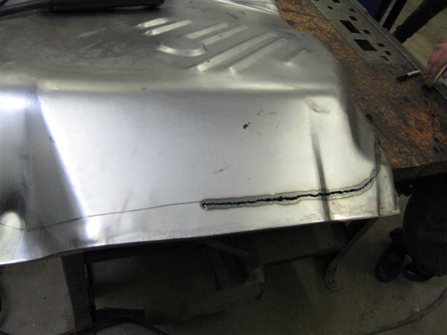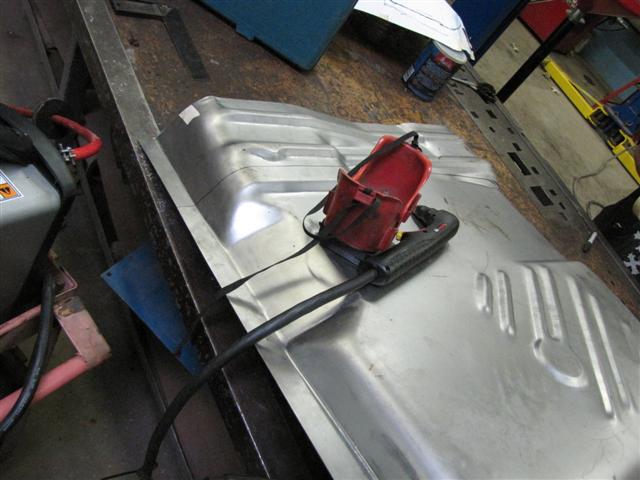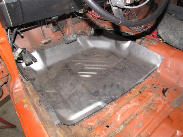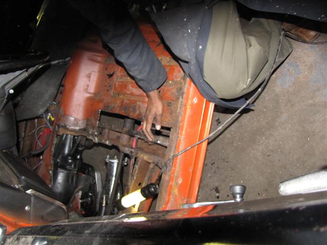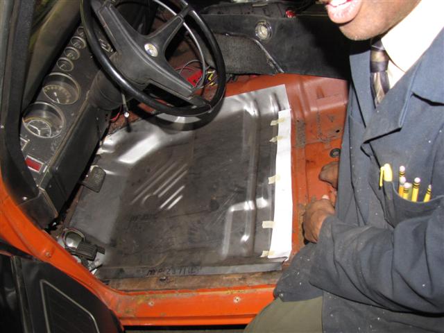 I have some pics of the new floor being chiseled out. First I had my students make a pattern by taping paper to the bottom of the new floor pan. Then we put the floor pan in place and they traced the outline of the floor cut out from the bottom of the car with a sharpie. I then cut away the excess paper from the pattern with a two inch overhang. Then I cut with the plasma cutter. I put it in place and saw where I could trim a little more away until I had an exact fit. Then with the floor panel in place there was an area where the manuel shifter hump removal left an odd shaped hole. I had my students put a piece of paper over the hole from under the car, while another student traced the shape from inside the car. I will cut that shape out tomorrow and see how it fits. I will also add two inches for the lap weld.