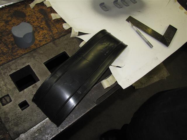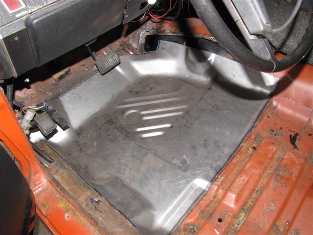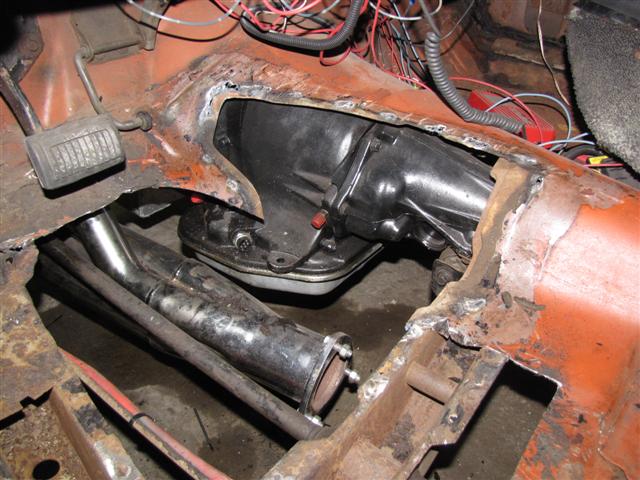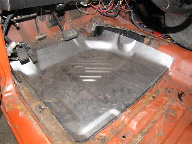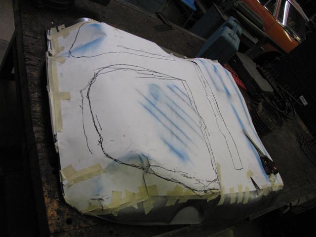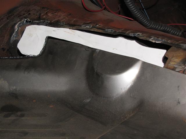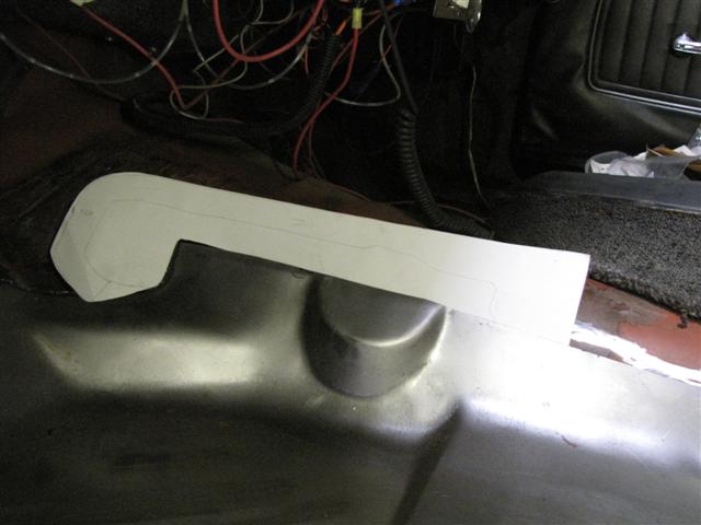 As you may have noticed there is an odd shaped hole on the transmission tunnel not covered by the floor. I had my students make this template and I just added an inch all around and cut it out.