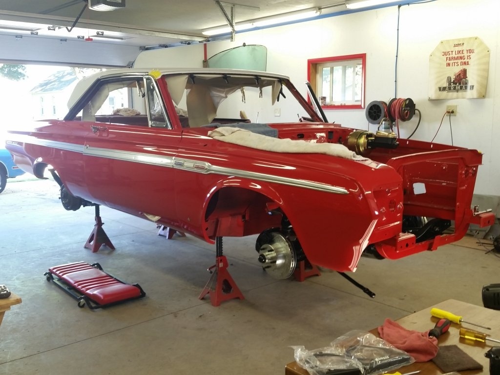 I don't think I ever posted these photos here yet. A friend is doing a 64 Sport Fury. I don't have any latest photos but these were taken late last fall. He is getting pretty close and it should be ready to debut this spring. Early on I found some original wheel covers. I can't remember who I got them from. Thanks to Shorthorse for helping with some headlight eyebrows last week. Joe took out the Poly and replaced it with a 440 with Fi tech injection. He is doing all the work himself except for the prep and paint. He doesn't have internet or a computer at home so he's not a member here. Looks like it's going to be a pretty one when done. tmm