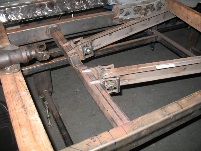 Once we got the engine mounts completed we moved on to the Truck Arm Cross-member, which I had previously tacked in place. Jimmy and I discussed the various options in terms of the vertical placement (the fore-aft had already been decided by the wheelbase) and in the end we decided to place the cross-member as far towards the top of the frame rails as could be managed without interfering with the floor, which is going to sit directly on top of the rails as opposed to channeling the floor over/around the rails.