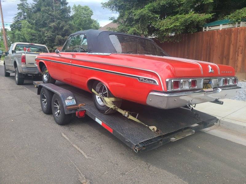 Any original paperwork?She's on the trailer and headed for home! A true one-owner, I got the original 1964 title, black plates, owner's/service manuals, build sheet. 383 4-barrel, auto drop top. I'll be posting up elsewhere for parts and resto advice.