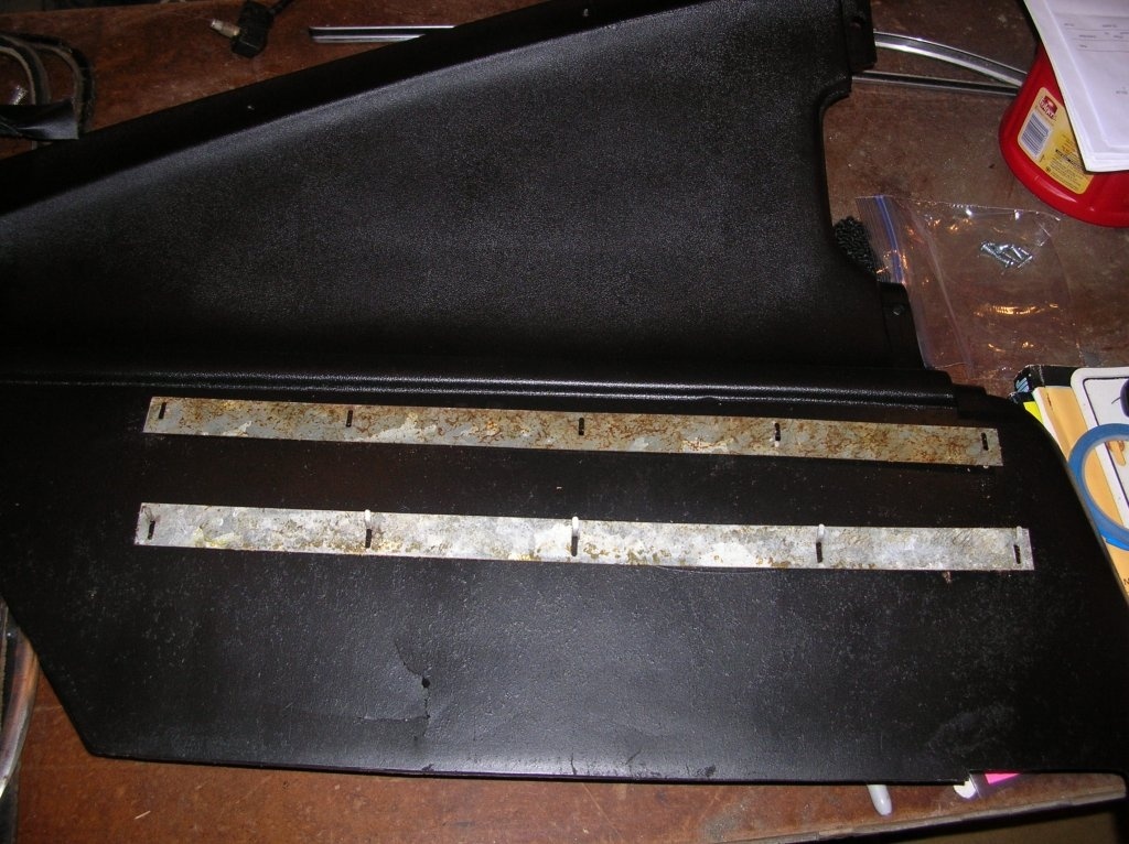 struck out on finding any chrome trim, but I did find two straight strap type pieces with notches and punch outs that line up with the holes in the trim panel....so it is now more confusing. Does the vinyl attached to the carpet get wrapped around the metal strap and than attached to the panel followed by gluing the remainder of the carpet to the panel.....stressful...lol