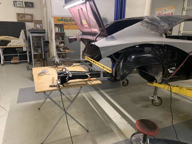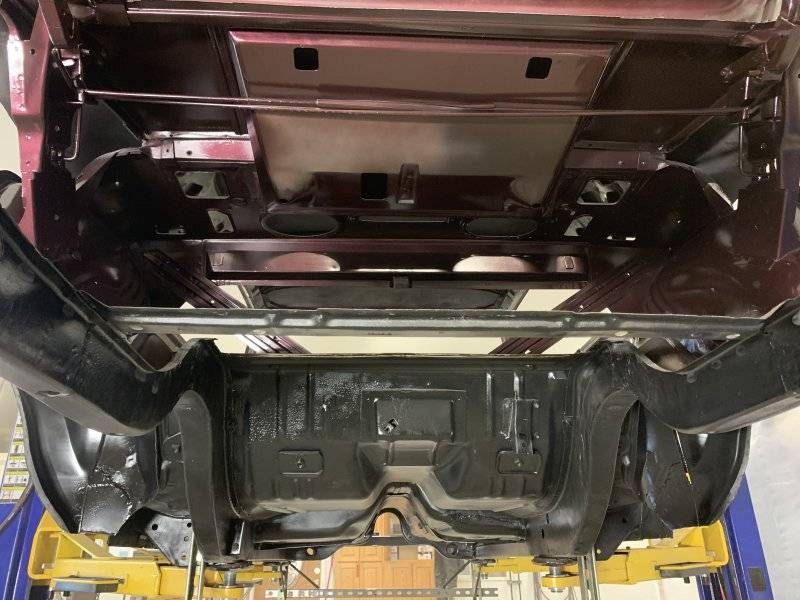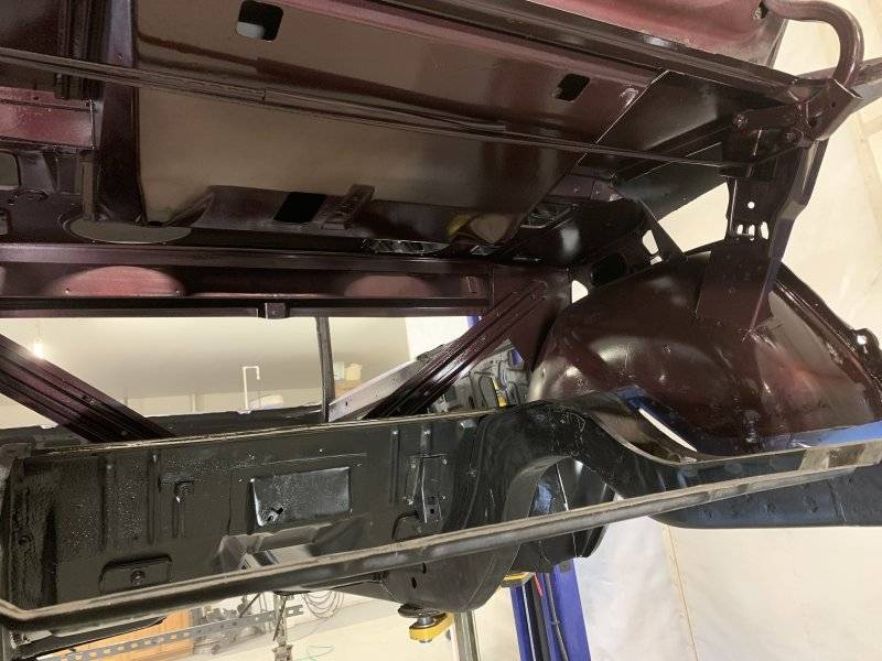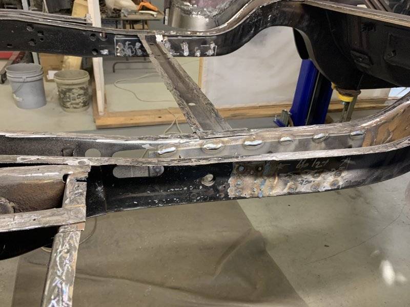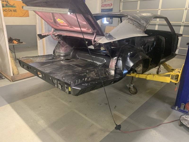 Making good progress, frame rail ends blasted, primed and tacked on, stiffened it up nice attaching the trunk floor with a bunch of clecos and some screws drilled up through the bottom to mark all the flanges.