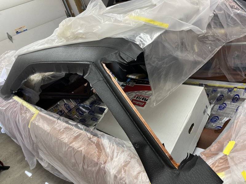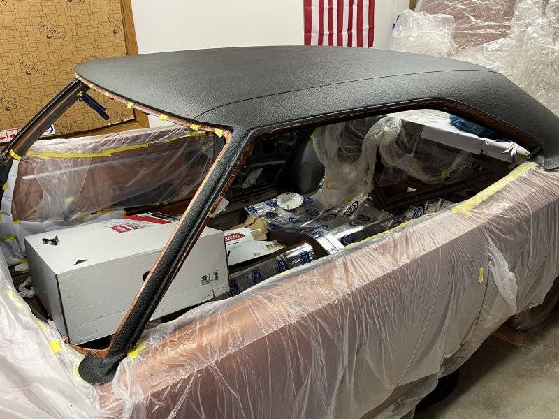 My next step was to install the vinyl top. It has been sitting wrapped up in the box from Legendary for almost 10 years. So I let it sit on the roof of the car for about a month so that the folds were close to being all the way out. I bought three cans of the DAP vinyl top glue in the aerosol cans.