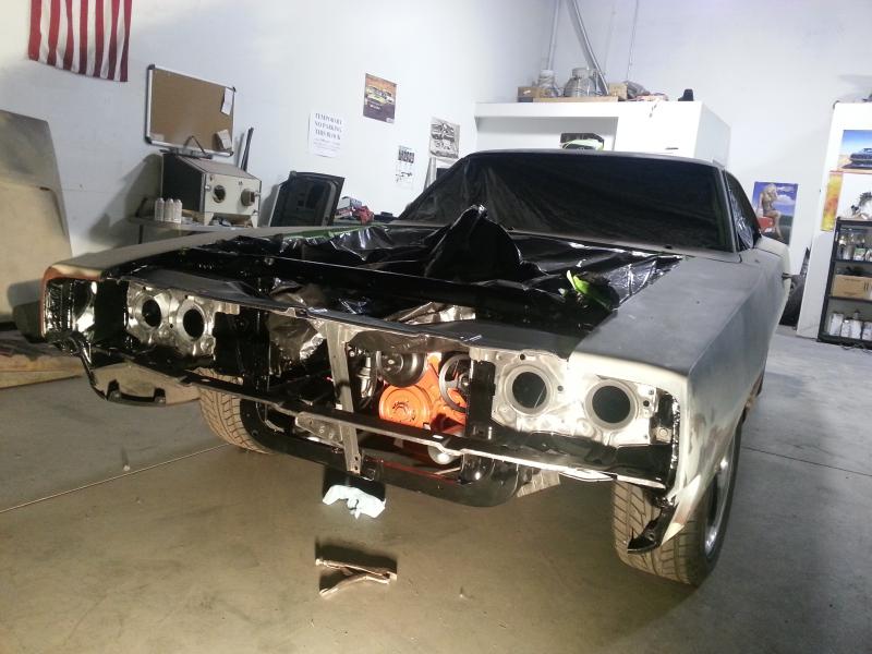So if anyone has a '69 Charger center "I" beam grille trim piece it'd be a huge help if I could pick it up from you for a reasonable price! Didn't let those issues keep me down though, got the headlight hardware all blasted, flat-cleared and back on the frame
