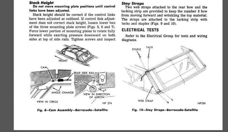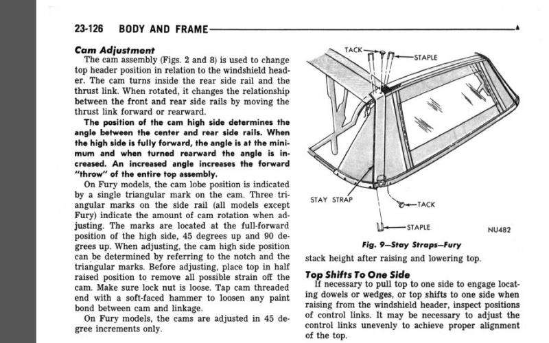 Hey guys, can anyone tell me how far the trim sticks up that wraps around the convertible top on a 69 Road Runner convertible? Is the reveal supposed to be painted? Also, I have a problem with the top rubbing on the drivers side when it retracts and it is wearing on the seam toward the back of the top. I also noticed the top is off about a quarter to half inch from drivers side to passenger side....is there a way to adjust the top over a bit so it doesn't rub? Thanks!