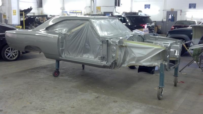 I stopped in to take a few pics today-the car has paint! The doors, fenders, hood and decklid were all painted off the car. The car should be wet sanded, buffed and assembled in the next week or so. The vinyl top is supposed to be put on next friday. The only paint work left will be the hood stripes and the blackout behind the grille. Sorry for the crappy cell phone pics but that's all I had with me. View attachment 139357