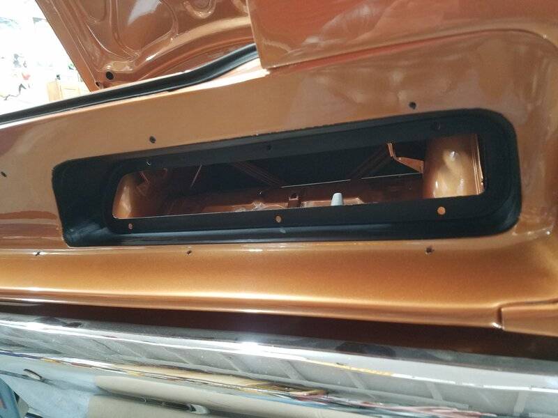 Everytime I walked around the back on this car, it always bugged me that the copper shows through between the taillamps and the finish panel. Did a lot of web searching without finding an answer if it was blacked out from the factory. Big thanks to Darrin aka Big D A12 for confirming that this area did indeed get black, probably at the same time as the radiator support blackout. Didn't feel like taping off the entire car to spray, so used a small foam brush with the flat/textured paint I used on my dash and steering column. Not perfect, but works in my world now.