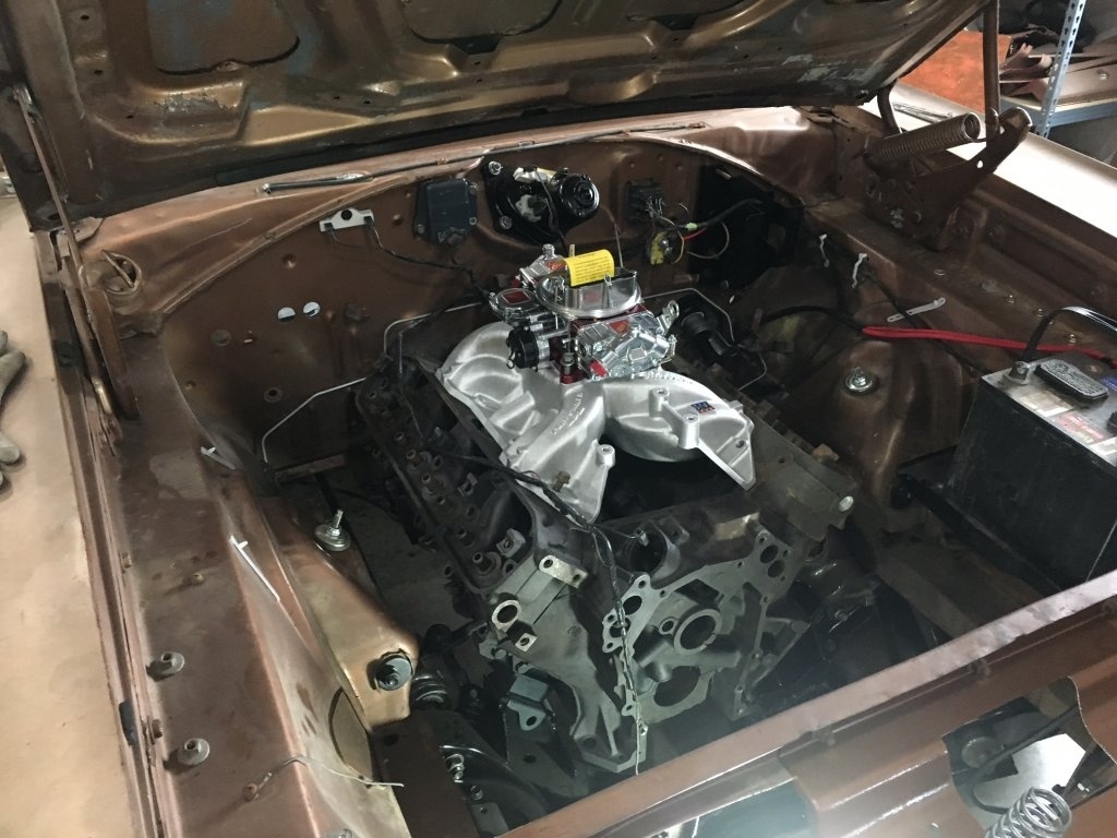 My brother was concerned about clearance between air cleaner and hood with the intake I bought for the new engine we're putting together so we temporarily installed tranny with bare block, heads, intake and carb. He was right, not enough room. I don't want to cut hood up as I want the "stock" appearance on the outside for sleeper mode. Ended up buying moroso low profile/drop down air cleaner, but it's still a little tight. I'm going to look for a 2.5" filter to replace the 3" and see if that gets what I need. Otherwise we'll need to machine the intake a bit too.