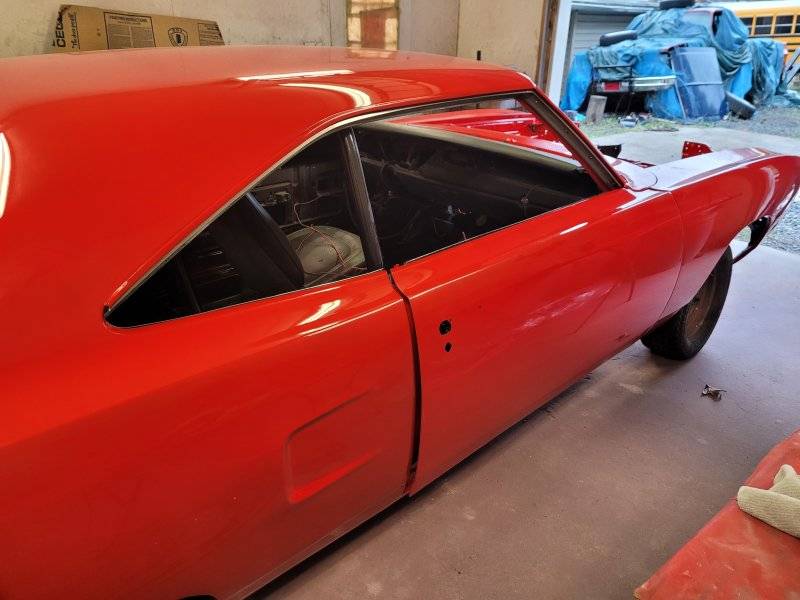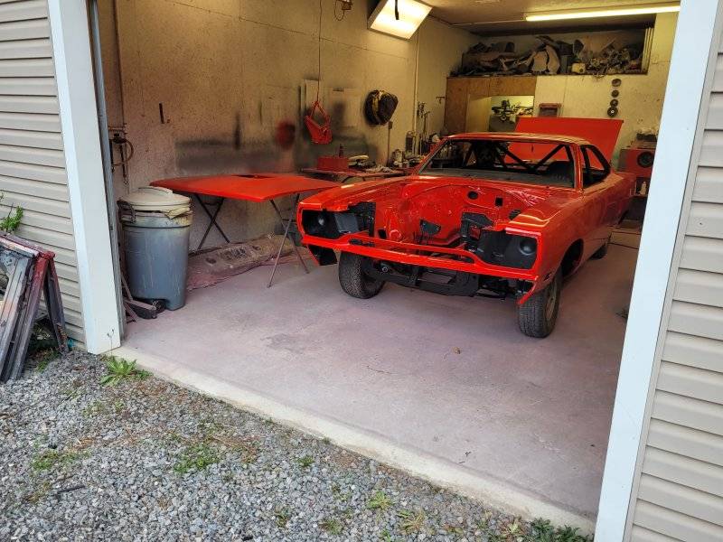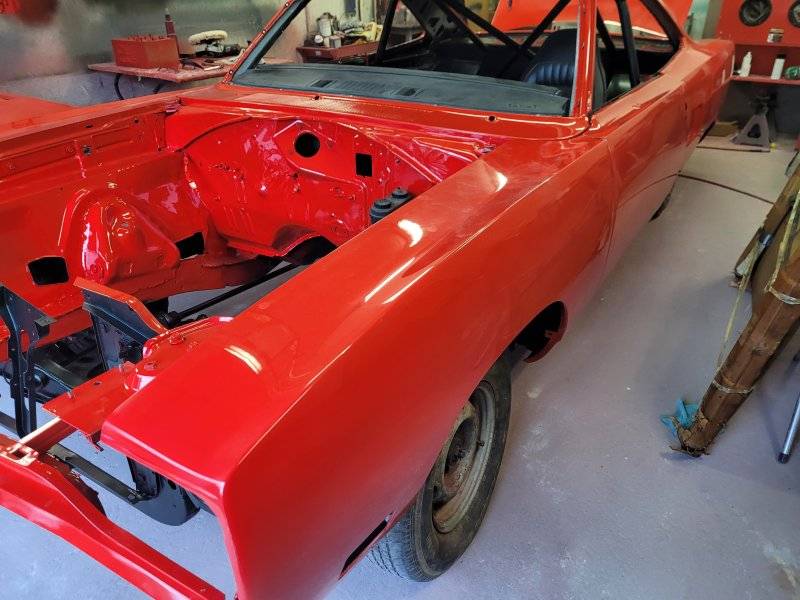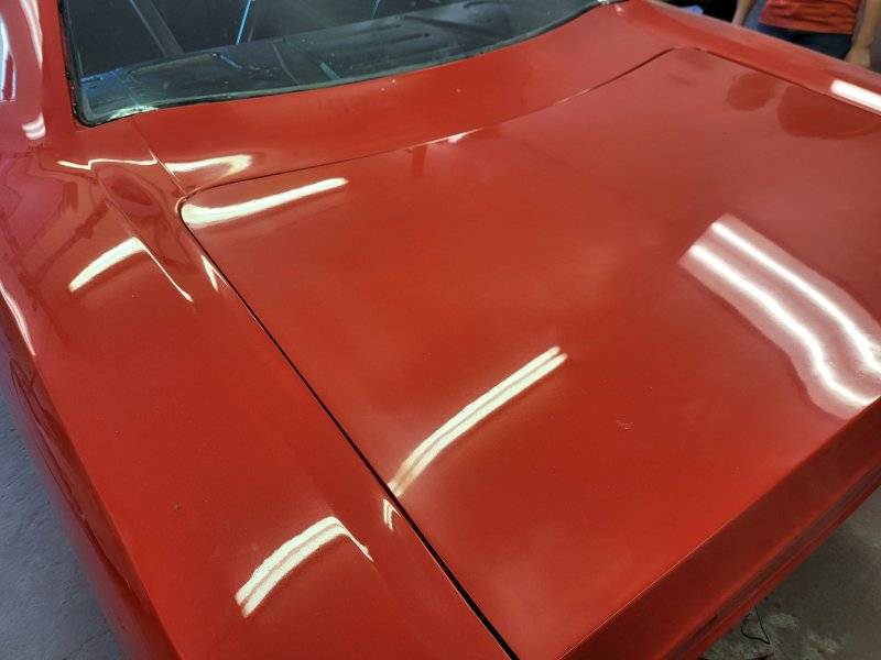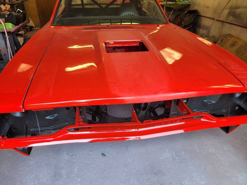 Looks great, once you get it put together and outside I think it will look fine. My favorite red is the old Viper Red, I painted my buddies Duster that color and it really stands out.Painted! Hood stripe and side scoops which he forgot and final sanding and buff,supposed to be able to pick up end of the week! IT looks orange pictures but it is red in person, which is what I wanted, a little deeper red would have been better but finally out of paint jail. 3 1/2 years. Reassemble and drive.